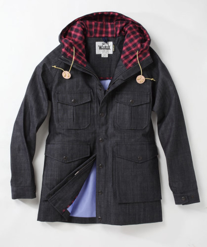 Der amerikanisch, klassische Mountain Parka wurde als Mantel mit einem engeren Schnitt in einem blauem sowie schwarzen Baumwoll Gore-Tex Material neu interpretiert. Das klassische Woolrich Karo wird im Innenfutter aufgegriffen.
